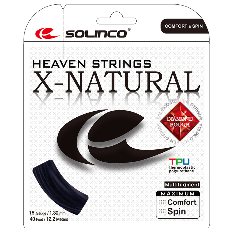 Solinco X-Natural Diamond Rough (Black) 200m Reel Posted 1st December 2020 by Charlie Solinco X-Natural This arm-friendly multifilament string is a great all-rounder with incredible spin potential for a multi, thanks to the Diamond Rough technology. A great multifilament string. Colour: Black Gauges: 1.30mm(16), 1.20mm(17) Length: 200m, also available in 12m String Type: Multifilament