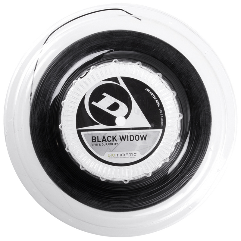 Dunlop Black Widow 200m reel Posted 1st December 2020 by chris-5275 Dunlop Black Widow (black) 200m reel The Dunlop Black Widow Tennis Strings are designed for spin and durability, with a premium, high tensile mono-filament polyester construction in a hexagonal outer profile. SPECIFICATION: Construction: High-tensile, mono filament premium polyester Gauge: 16 / 1.31mm or 17 / 1.26mm Profile: Hexagonal outer profile Length: 200m