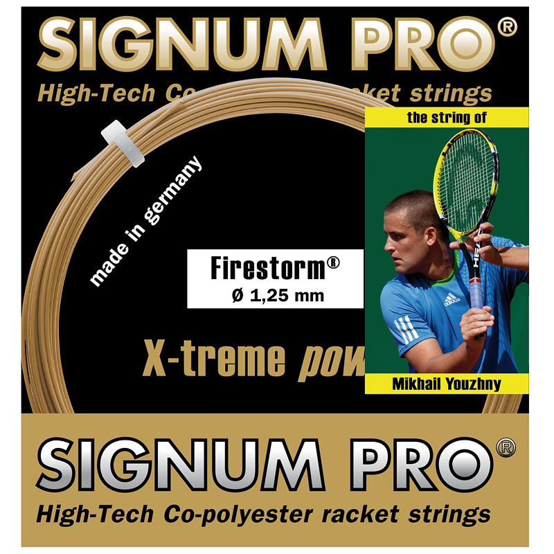 Signum Pro Firestorm (Gold) 200m reel Posted 1st December 2020 by Charlie Signum Pro Firestorm (Gold) Reel High tech co-polyester tennis string boasting great power and control – Used by Mikhail Youzhny for X-treme power. Colour: GoldGauge: 1.20, 1.25, 1.30mmLength: 200mString Type: Polyester