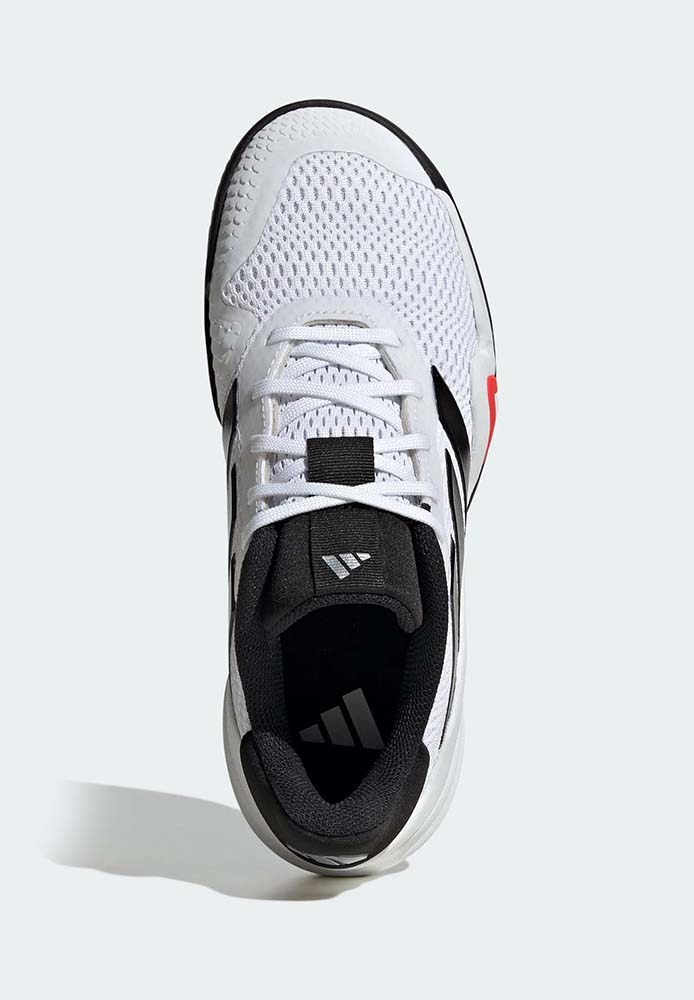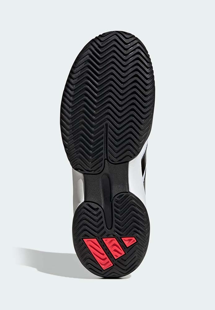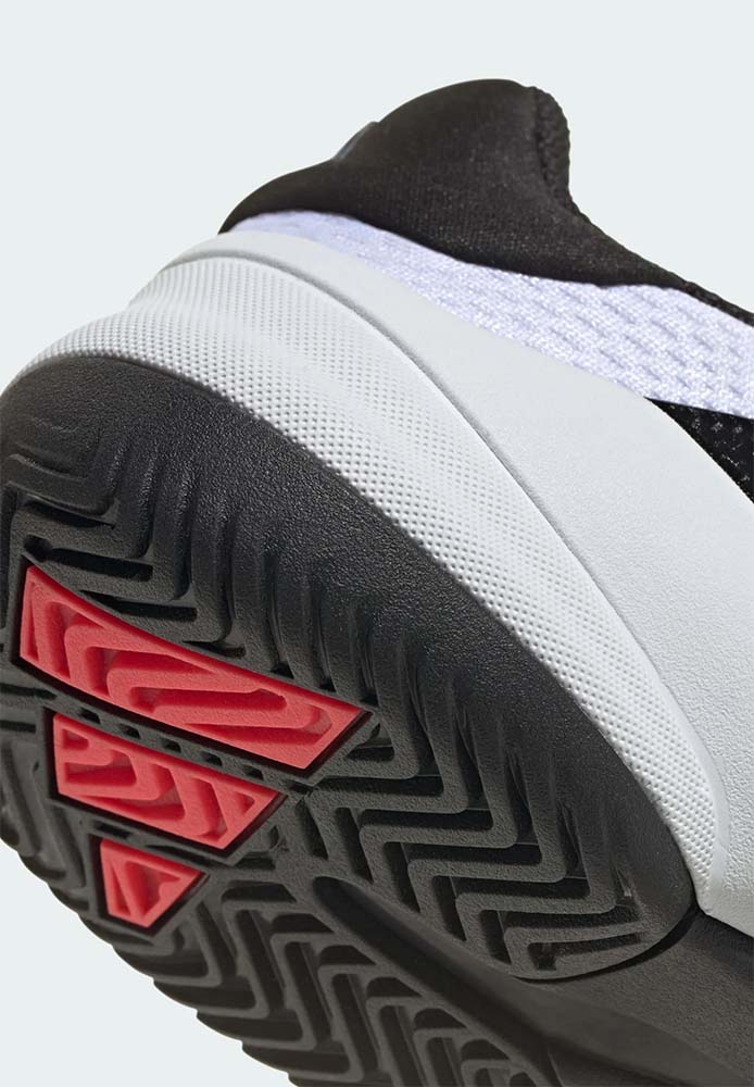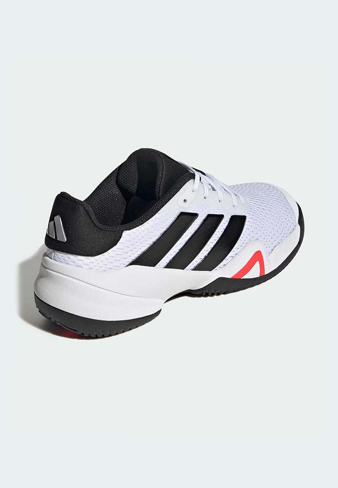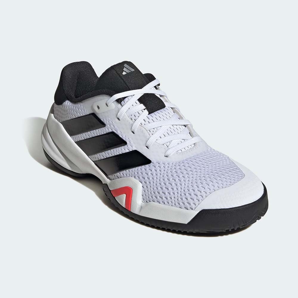 The adidas Barricade K is an allcourt tennis shoe designed for high performance and durability on various court surfaces. It features a robust Textile/synthetics upper for a supportive and stable fit, complemented by a comfortable Textile lining and insole with cold padding. The main durability comes from the addition of toe caps and a durable Natural rubber sole, ensuring the shoe can withstand the aggressive movements and court friction typical of tennis. The shoe is secured with traditional Laces and has a classic Round tip and Flat heel type. Its construction is built for the intensity of the sport.