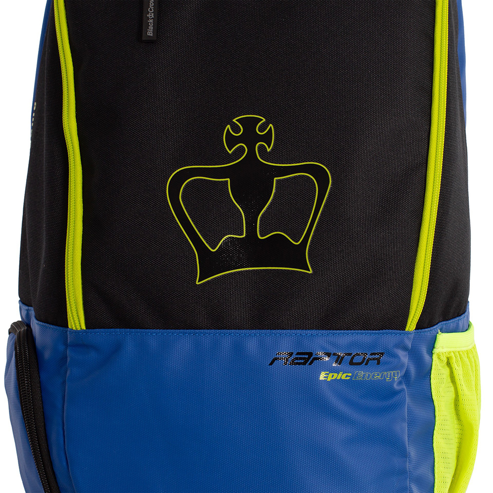 The Black Crown Raptor backpack is made of 30% Eva and 70% PVC materials on the outside and 100% polyester on the inside. It combines the colors blue-black-yellow and black-red. Always looking for the best design for the player.