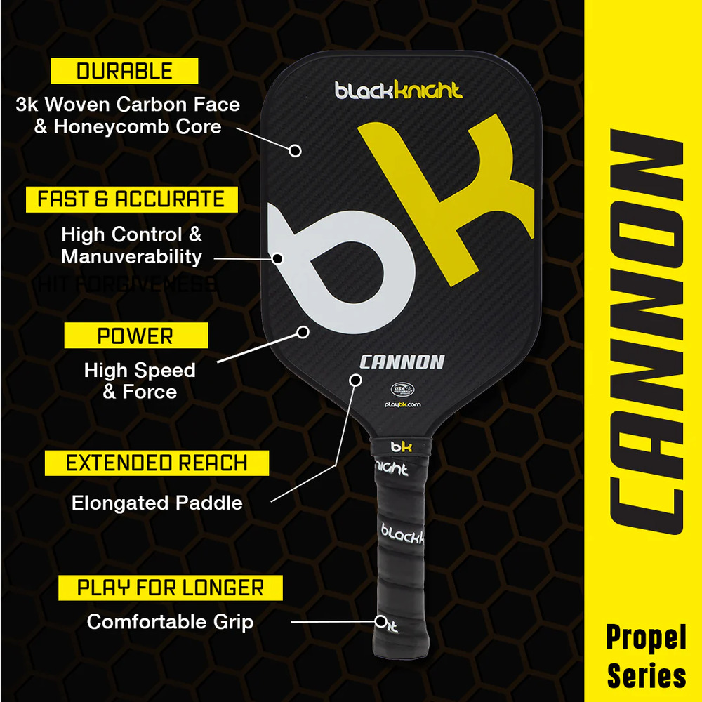 The Black Knight Cannon Pickleball Paddle is a high-performance, USA Pickleball-approved paddle designed in Canada, ensuring top quality for all levels of play. Engineered for power, speed, and force, its elongated design enhances reach and court coverage, ideal for strategic gameplay. The paddle features a 3k woven carbon face and a honeycomb core for durability and resilience. With thermoforming technology, it offers a generous sweet spot, optimizing both performance and control, making it a reliable choice for players seeking a powerful and responsive paddle.