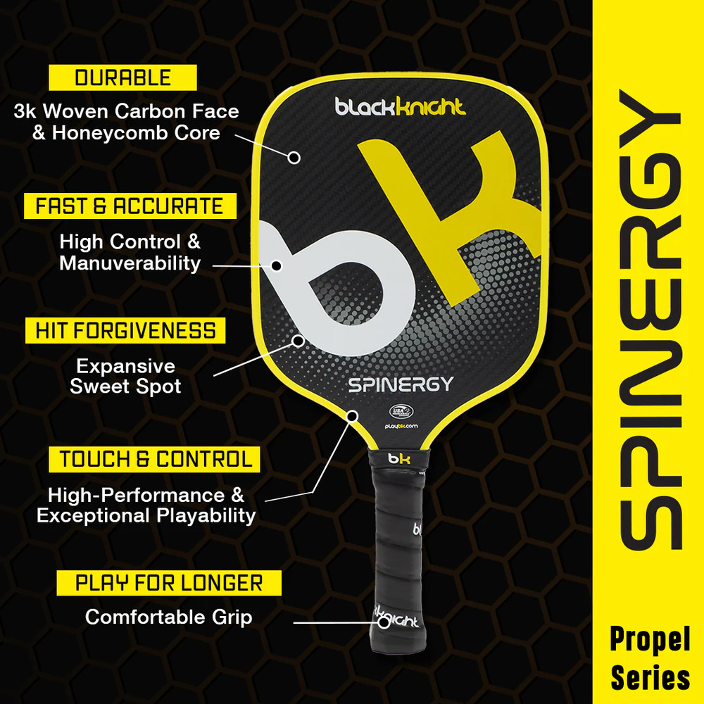 The Black Knight Spinergy Pickleball Paddle is USA Pickleball-approved and designed with Canadian quality control for peak performance on the court. Crafted for touch and control, it features a 3k woven carbon face and a honeycomb core for exceptional durability. The paddle’s expansive sweet spot offers maximum forgiveness, making it ideal for players of all skill levels. With thermoformed construction, the Spinergy delivers reliable responsiveness and precise control, ensuring every shot is impactful and controlled.