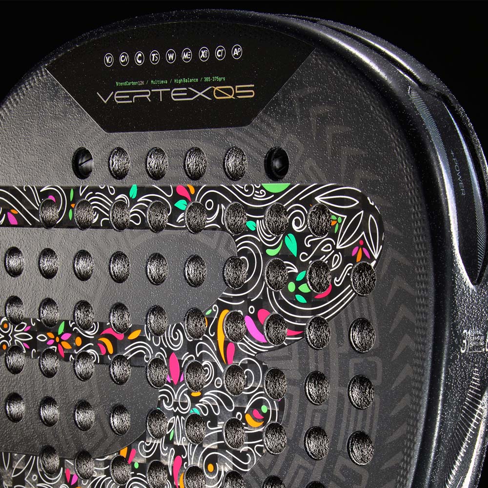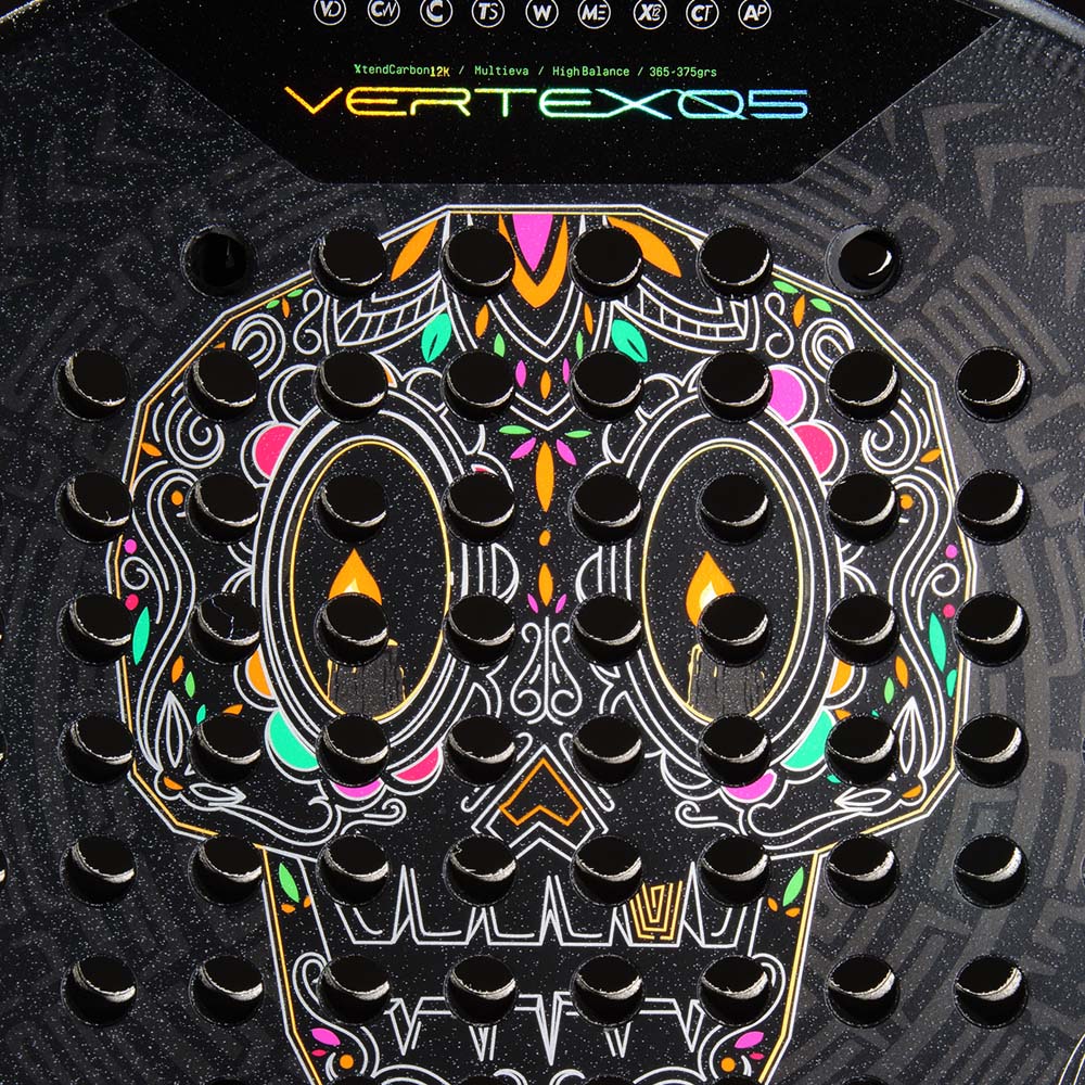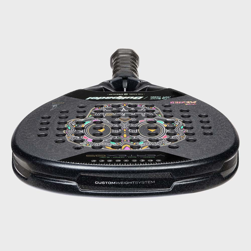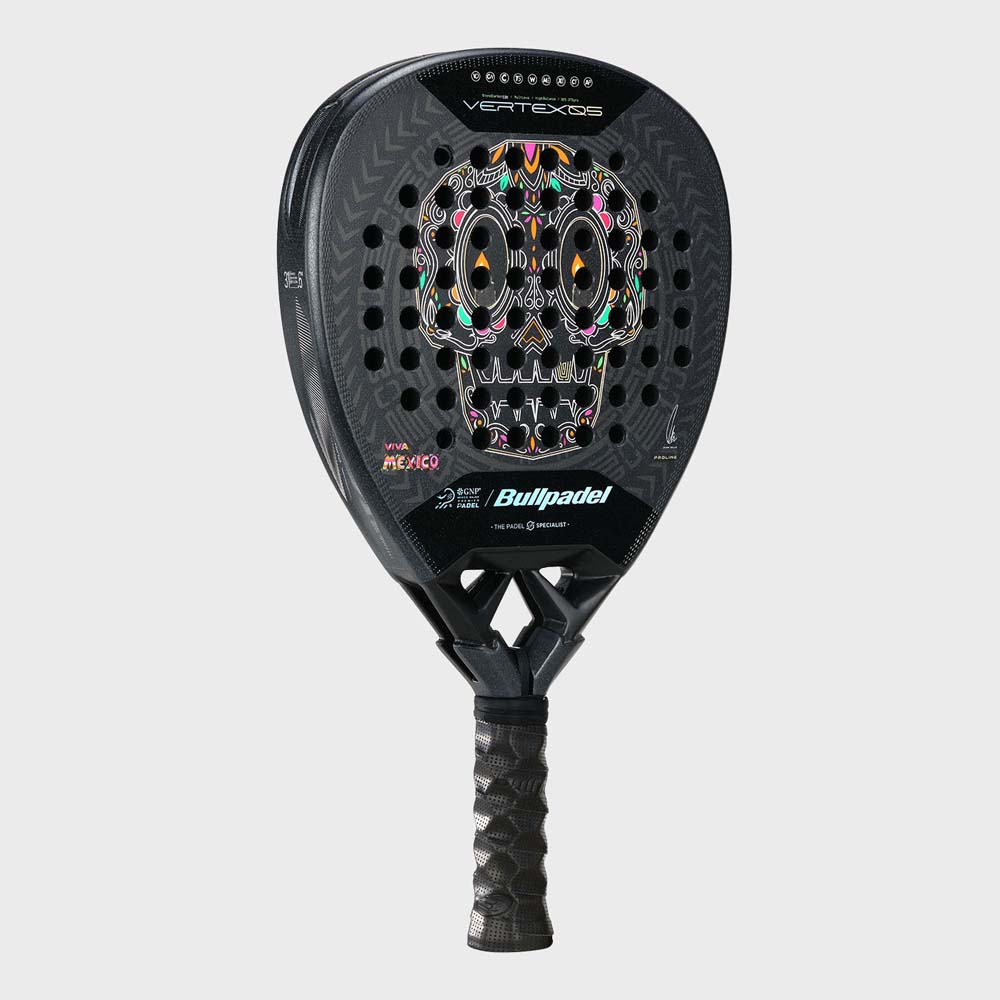 The Bullpadel Vertex 05 MX LTD Racket features an imposing design that combines strength, precision, and the Mexican spirit. The dark-toned base is highlighted by geometric and floral motifs inspired by traditional Mexican art and architecture. Red and gold details create an elegant contrast, radiating energy and power. The overall design reflects the racket’s competitive and technical character, engineered for players seeking maximum performance with a unique visual identity. This model features the signature of Juan Tello and the inscription ‘VIVA MEXICO’.