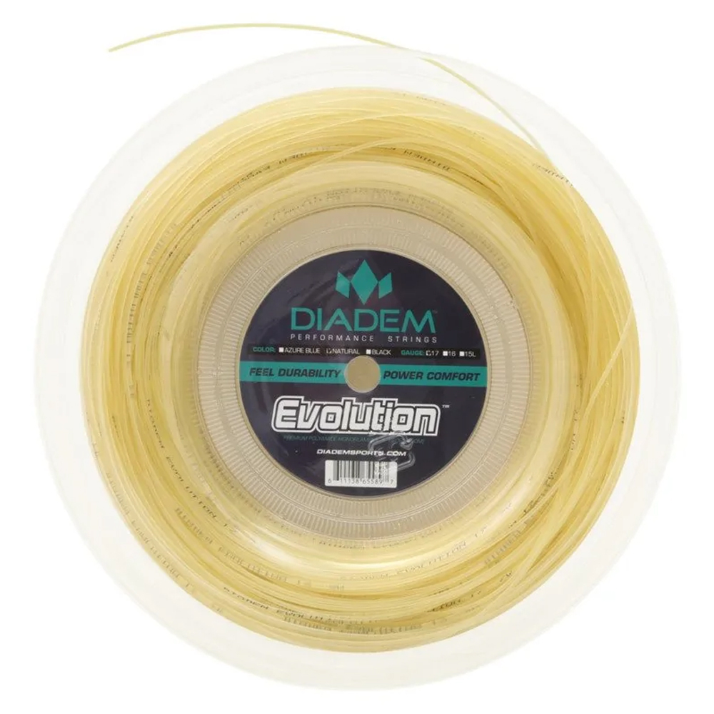 The Diadem Evolution is an extremely unique monofilament made from a premium polyamide. It boasts a comfort level on par with some of the best multifilaments on the market. The Evolution is made with this string with a slippery coating for greater snap back and enhanced spin-potential. The low stiffness level makes this a perfect string for any player looking to minimize the impact shock of a lighter racquet.