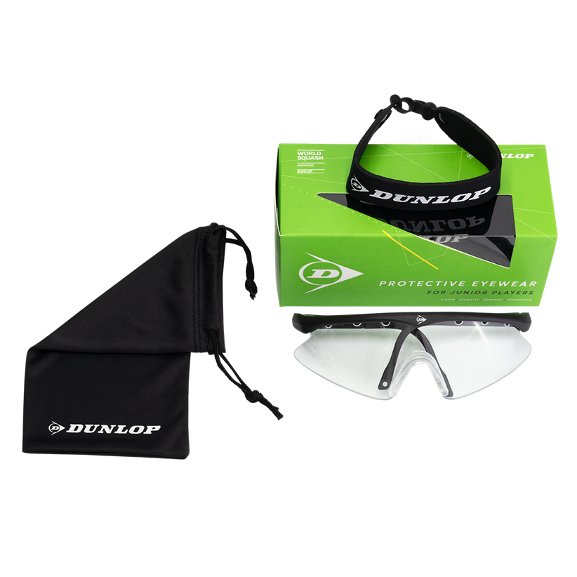 Dunlop Junior Squash Eye Protection is a premium eyeguard goggle for juniors for use during squash. It offers a contoured lens shape for peripheral vision, ergonomic profile for additional stability and secure fit, adjustable arms and a lightweight frame. Colour: Black