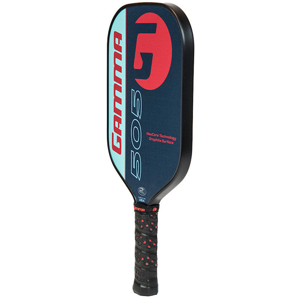 The GAMMA 505 features NeuCore Technology and a 25% thicker large-celled core that provides a soft, quiet and responsive feel. The textured elongated graphite hitting surfaces enhances your paddle with explosive power, finesse and spin. The extended handle is perfect for two-handed backhands.