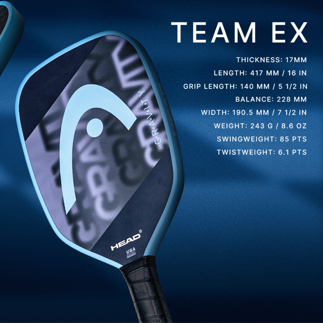 The HEAD Gravity Team EX offers optimal control with added spin and power, thanks to its elongated sweet spot shape and durable composite surface. Featuring SpinOn lacquer for enhanced spin potential and a soft butt cap for extra comfort, this paddle is perfect for players who prioritize precision and spin.