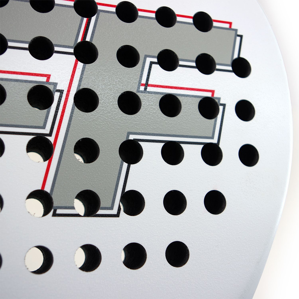 The padel features a teardrop shaped head which allows for an attacking game without sacrificing control, a rough textured surface for optimal grip, control and spin, and an even balance.