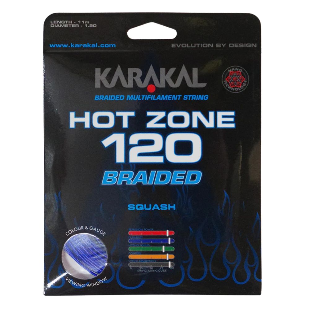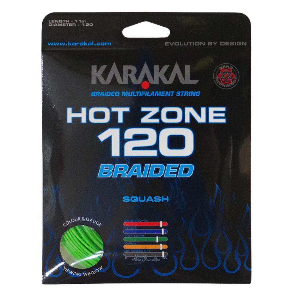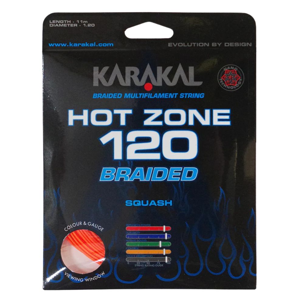 The Karakal Hot Zone Braided 120 is a Hi Tensile multifilament core wrapped squash string with Braided outer twist response filaments that deliver an excellent combination of Power and Control. Finished with a textured Nano Elastomer Resin coating, this Power rich string delivers amazing shock absorption properties with enhanced feel and durability. The Hot Zone Braided 120 gives uniquely Powerful, Controlled and comfortable performance. With a limited drop off in performance the Karakal Hot Zone Braided 120 squash string is good for all ‘off centre’ shots and perfect for players looking for Power and Control. Karakal Nano Technology is a revolution in String manufacturing. Adding ‘nano’ sized particles at a molecular level changes the cell construction and instantly improves the feel and durability of the strings.