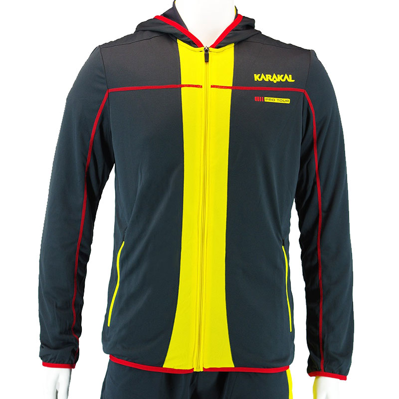 This is a four way stretch technical breathable hoody, constructed using 93% Karakal Cool Tec, 7% elastane and shaped to fit your body making it extremely comfortable to wear. The perfect hoody for warm up or cool down it is available in graphite with yellow panels and red piping and print to compliment the rest of the Pro Tour range.