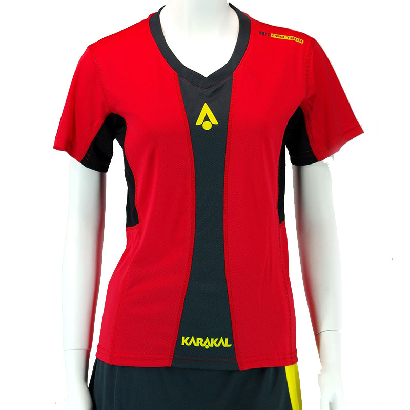 The ladies clothing comes with all the benefits of the superlight Karakal Cool Tec fabric which allows the body to breathe and is exceptionally comfortable. The Tee shirt has a V neck and is body shaped for a flattering fit. They are available in 3 colours, and come is size XXS-XL.