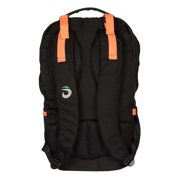 Key Features – Dual-Purpose Storage: The main compartment features padded pockets specifically designed to secure either a racket or a laptop. – Superior Comfort: Engineered with an ergonomic strap system and 15 mm breathable padding to ensure comfort even when fully loaded. – Durable Construction: Built from high-strength nylon with a rugged TPE back for extra protection and long-term durability. – Integrated Accessories: Includes a unique mini bag for extra organisation and a front pocket for quick-access essentials. – Modern Style: Features a bold Black Grey Print with orange accents and mesh logo detailing to stand out from traditional sports gear.