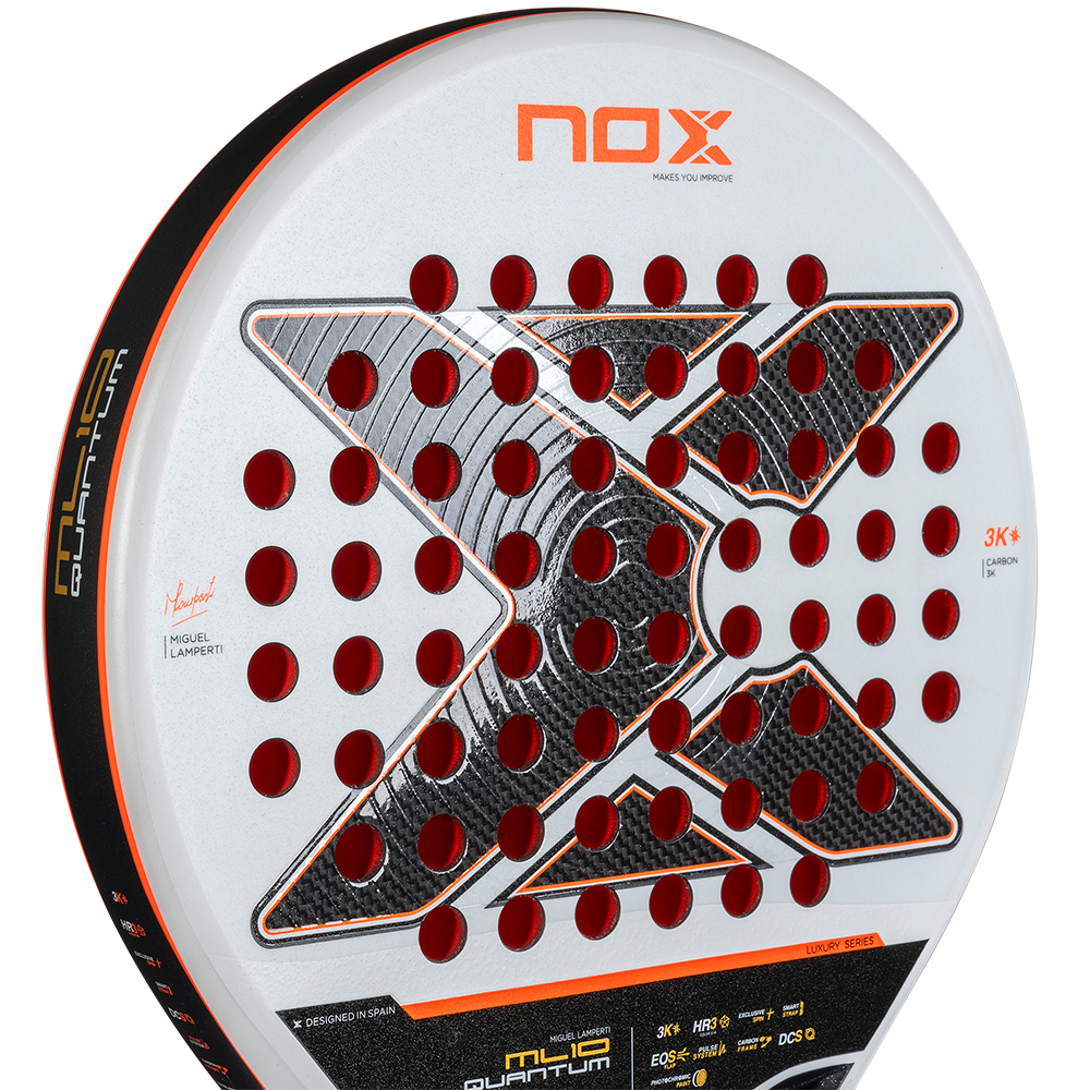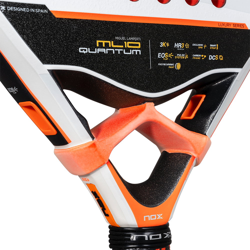 The ML10 Quantum 3K by Miguel Lamperti, awarded “Best Hybrid Paddle” in 2024 by Testea Padel, continues its evolution with NOX’s iconic HR3 rubber now in color and Photochromic Paint for a striking look. Designed for control, it features an octagonal cap for enhanced grip and EOS Flap technology for optimized weight distribution, ensuring fast, precise play.