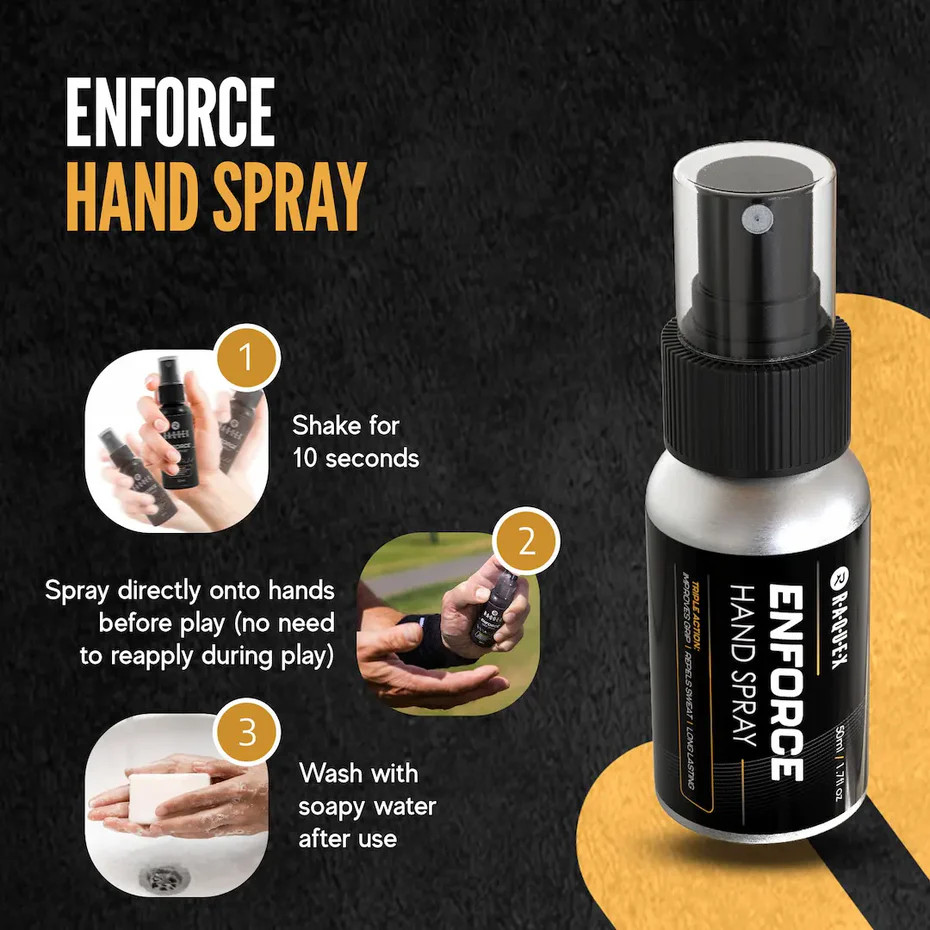 Applied directly to the hands or grip, Raquex Enforce forms an invisible, odourless barrier that repels sweat and moisture while enhancing friction for a secure hold. Unlike traditional resin, chalk, or powder-based products, Enforce is hydrophobic and long-lasting, keeping your hands dry throughout the entire game with just one application.