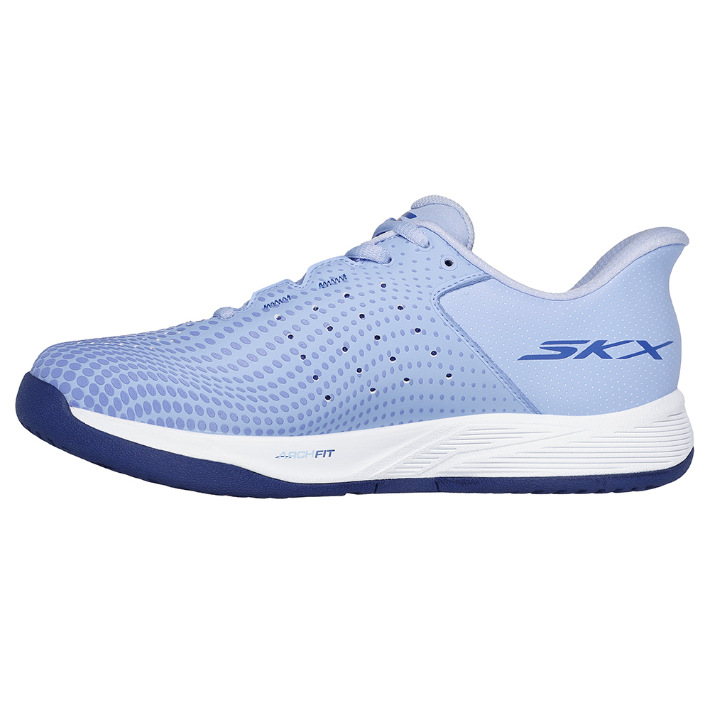 Skechers Womens Viper Court Reload Pickleball Shoe (Blue/White)Bring on the rallies in fantastic comfort that doesn’t quit wearing Skechers Hands Free Slip-ins® Relaxed Fit®: Viper Court Reload. Designed for Pickleball, this roomy lace-up features our exclusive hands-free Heel Pillow™ with an athletic mesh and synthetic screen print upper, removable Arch Fit® insole, and lightweight ULTRA FLIGHT® cushioning. This machine washable design is complete with a Goodyear® Rubber Performance Outsole built for increased durability and control on the court surface.