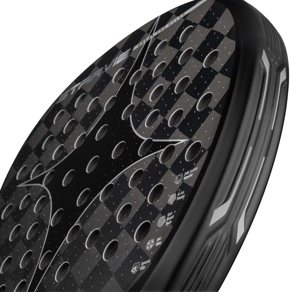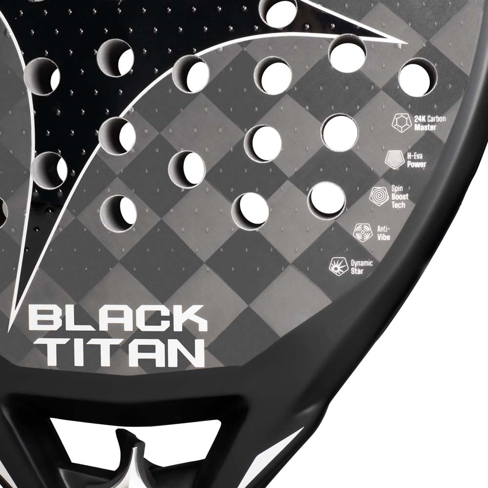 The Starvie Black Titan Padel Racket (2026) is a racket designed for advanced players seeking a combination of extreme power and control. It features a new hybrid mould and 24K Carbon Master for a precise and direct response. The H-Eva Power foam provides a firm and explosive feel, giving players total dominance on their shots.