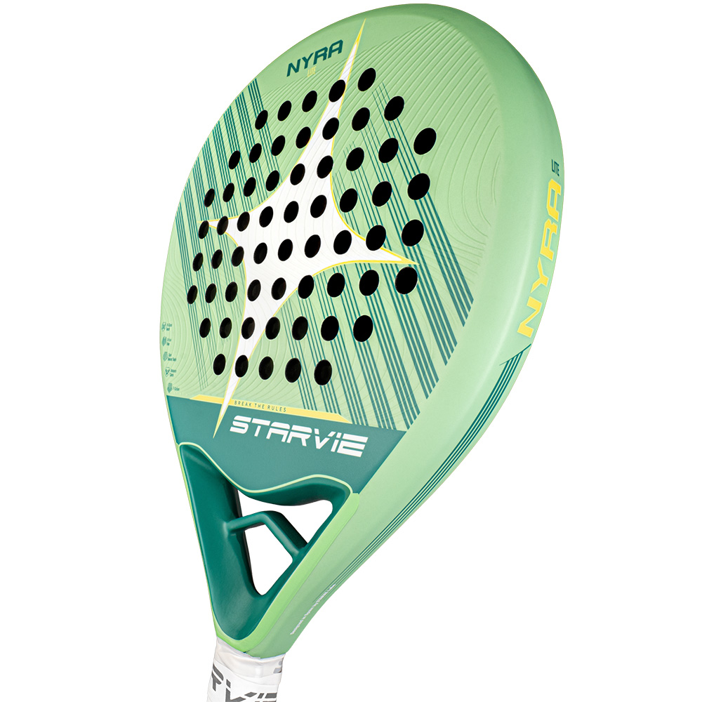 The Starvie Nyra Padel Racket (2026) is a round-shaped padel racket with a low balance and a light weight of 340–355 g, designed for maximum manoeuvrability. Its X-Glass Tech construction and S-Eva Flex soft foam offer a light, smooth, and comfortable feel, making it ideal for beginners. The racket also features Advance Core technology in its heart to improve stability and control, and to reduce vibrations for an enhanced playing experience.