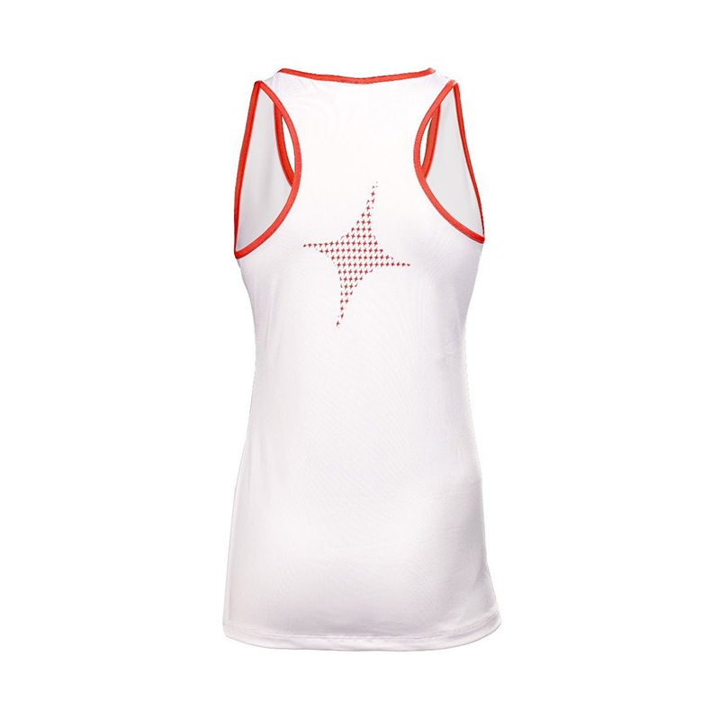 White paddle top with red accents. Trust your game and feel beautiful in your paddle clothes with this basic cut tank top by Starvie.