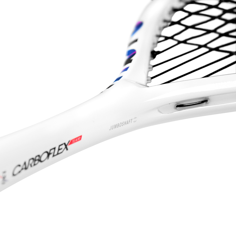 The Carboflex Team also features a jumbo shaft design, enhancing frame stiffness to further boost power without compromising control. Pre-strung with Tecnifibre Synthetic Gut, the racket is ready for immediate play and engineered to support the needs of improving players.