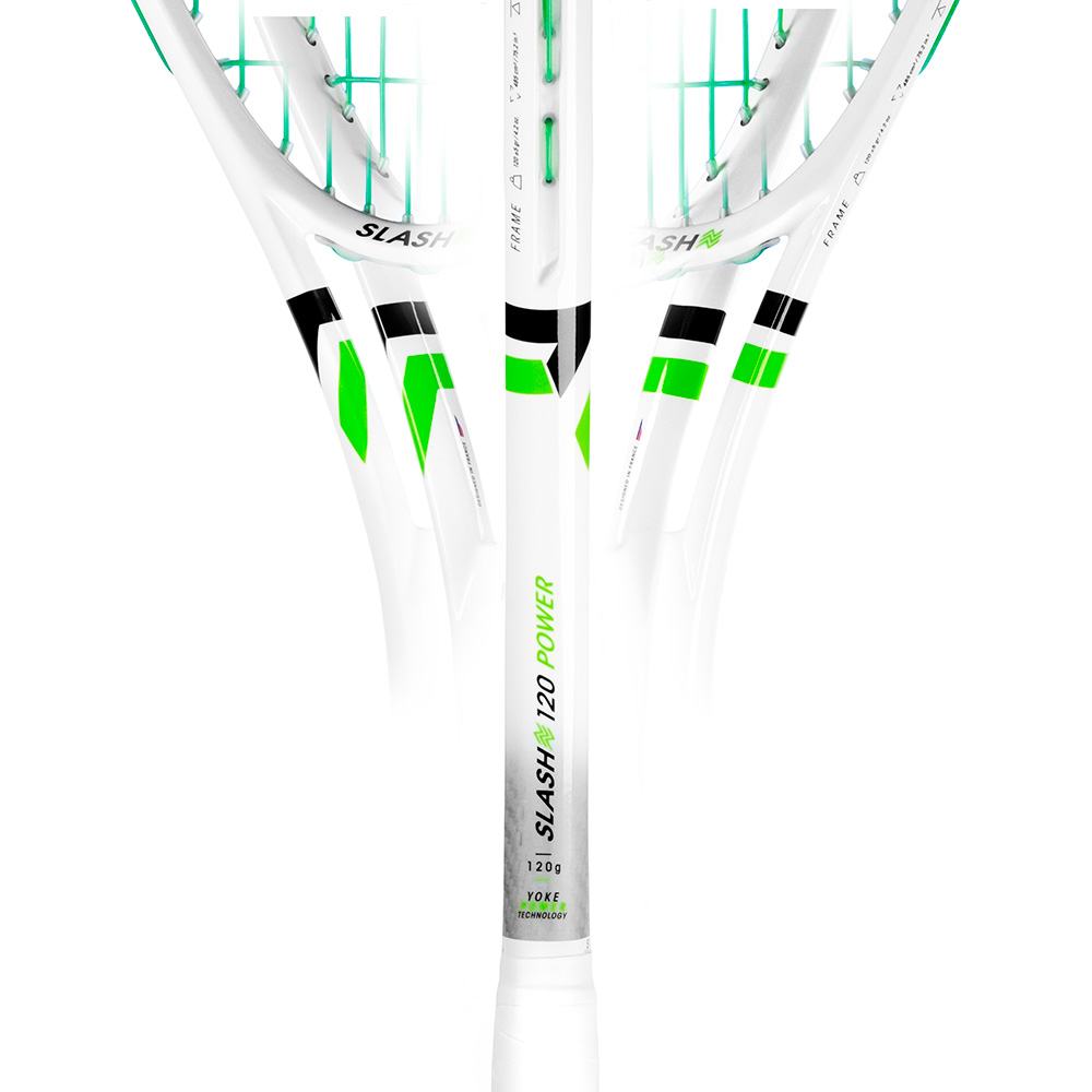 The new 2025 Tecnifibre Slash range, developed with world number one Mostafa Asal, is designed to deliver power and performance. The Slash 120 Power model is specifically engineered for easily accessible power. It features a larger, longer 485cm² head size, which increases string elasticity for more powerful shots. This is combined with an oversized shaft, an enlarged frame, and a smaller yoke for increased stiffness, resulting in a large sweet spot and high power levels.