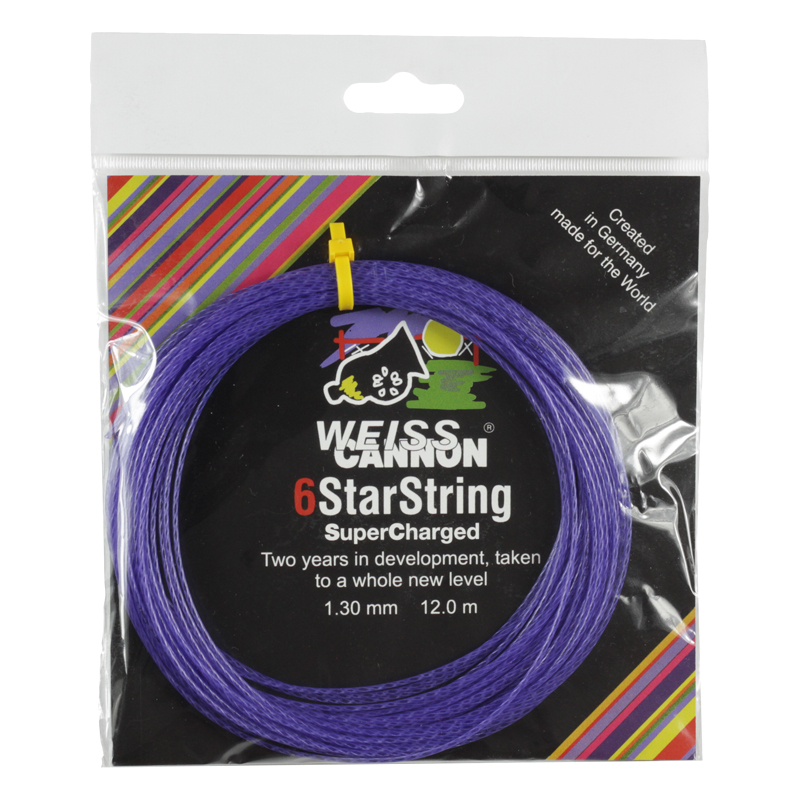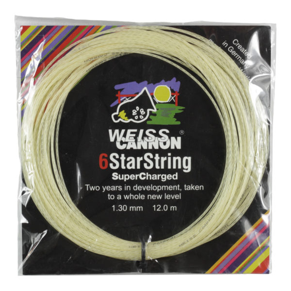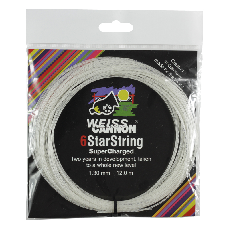Weiss Cannon state that their 6 Star String has been twisted many times to achieve the highest potential spin. Technicians say that they have used an entirely new high-tech process to produce the string by combining Multifilament and Monofilament fibres together. Due to the highly elastic raw materials used it is important to adjust the string clamps correctly to prevent damaging the string. When stringing, Weiss Cannon have recommended that it should be strung with 6% more tension then other multifilament.