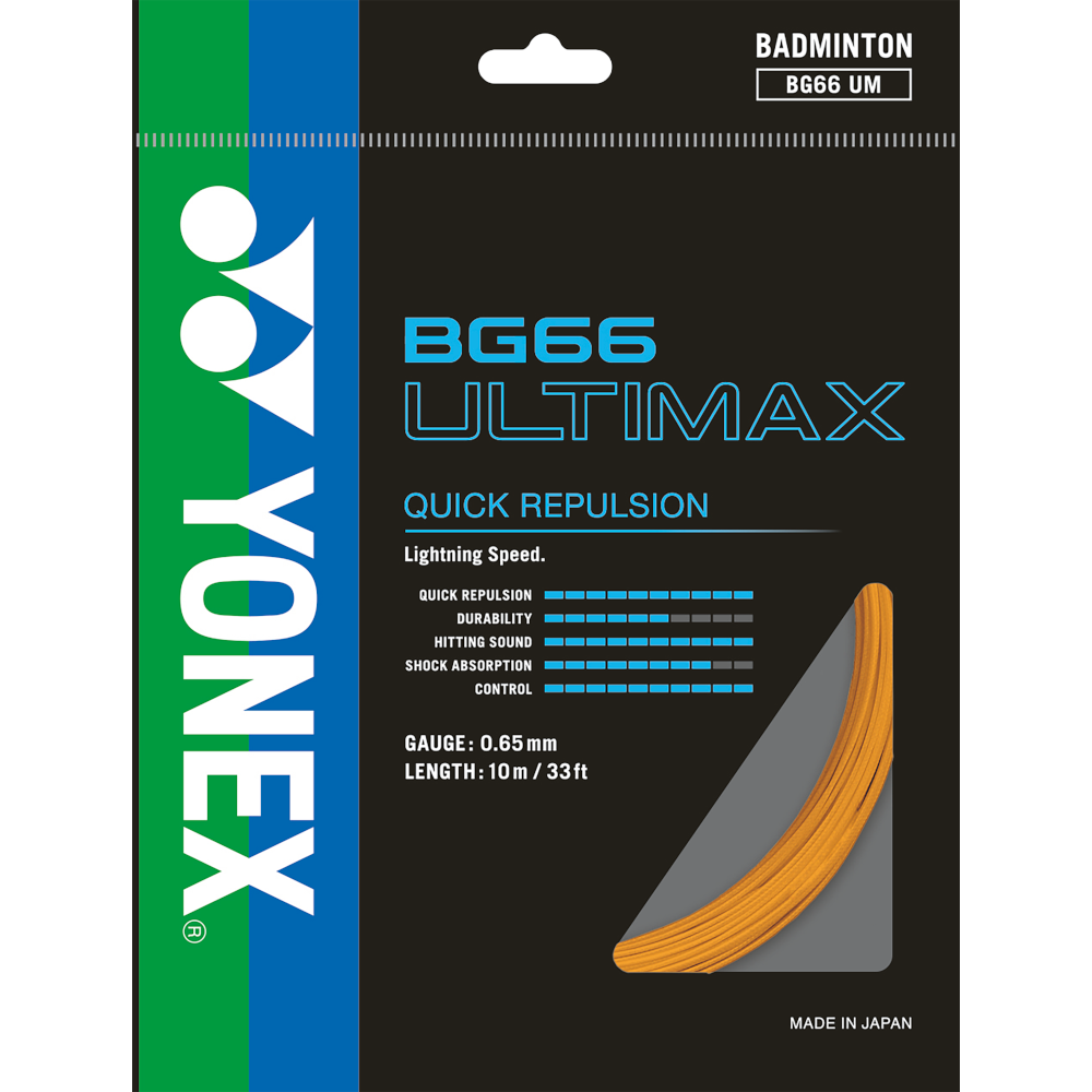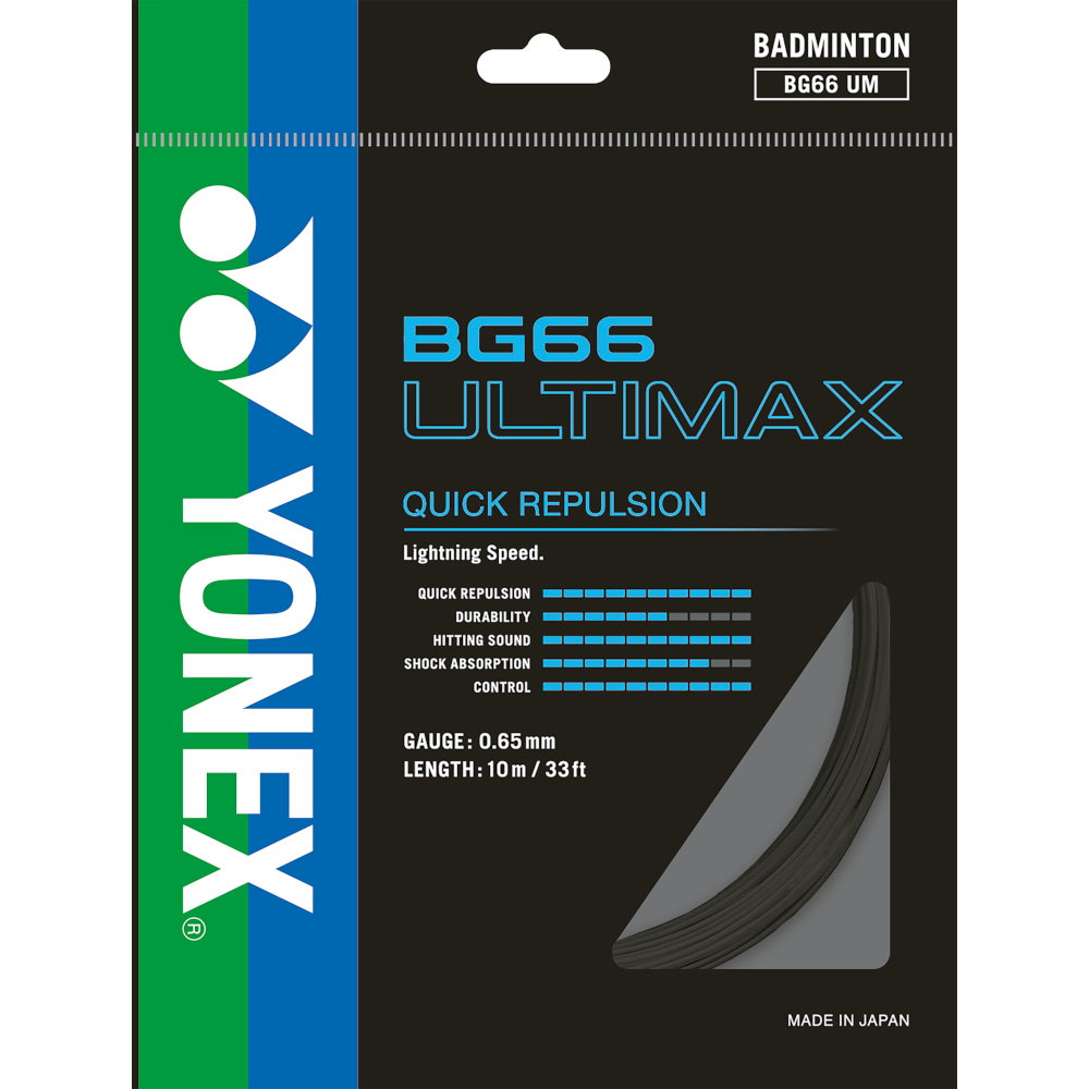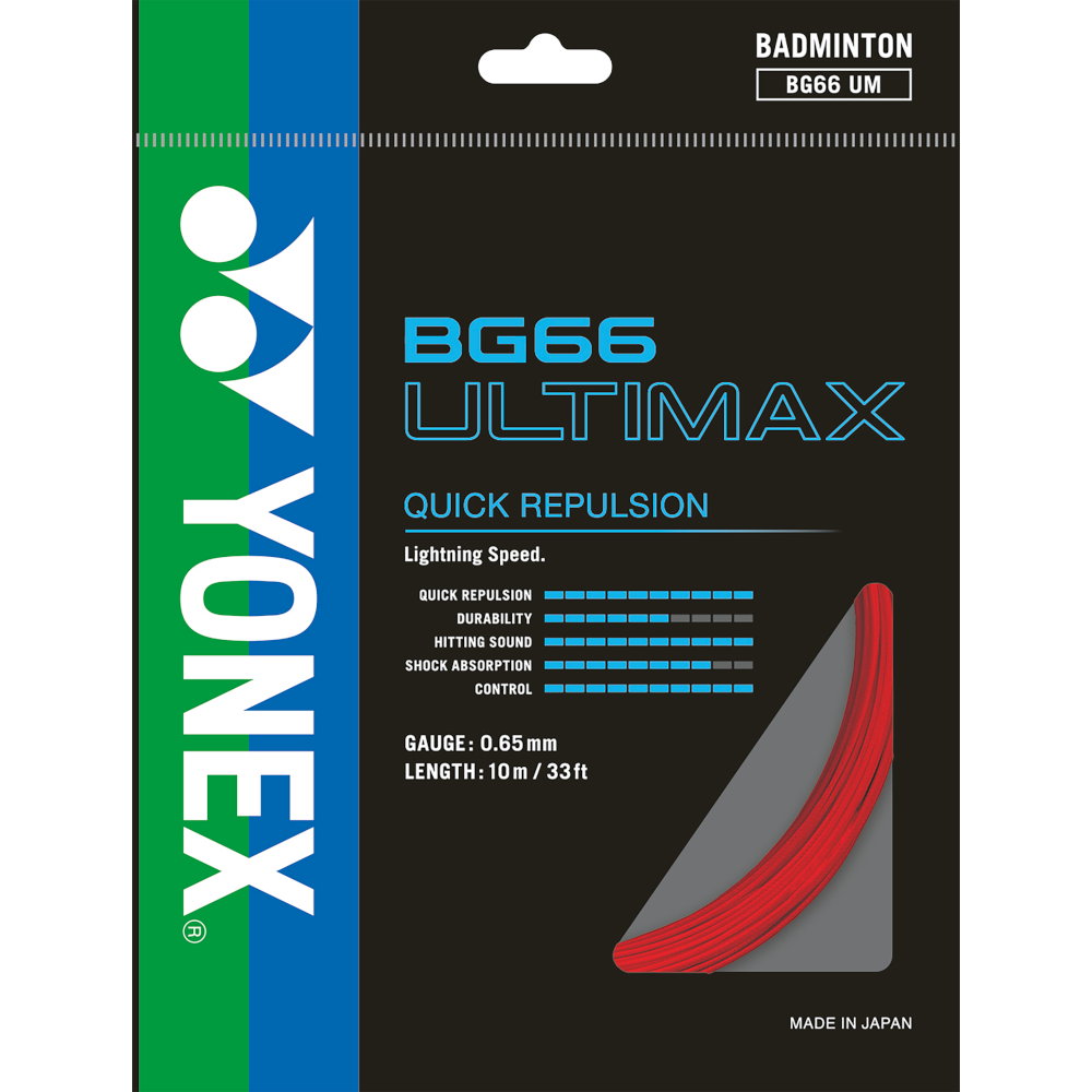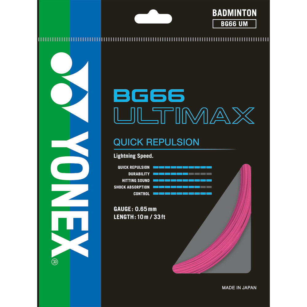 Yonex BG-66 Ultimax now comes in .65mm thickness. The BG-66 Ultimax badminton string is an ultra-thin gauge string has ultimate repulsion and clear hitting sound.