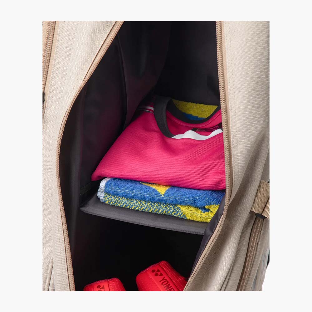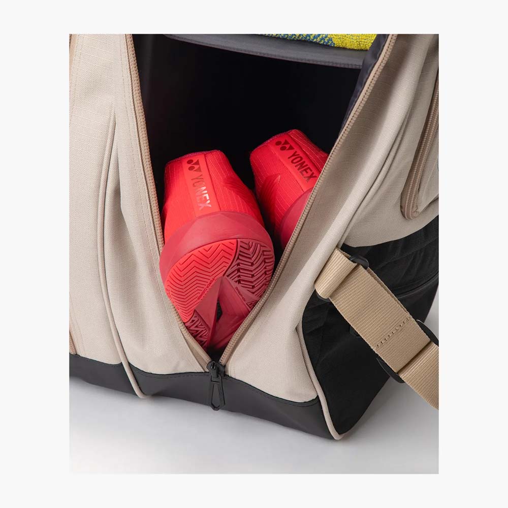Key SpecificationsCapacity: Holds up to 6 rackets (Tennis, Badminton, or Squash). The bag is divided into two main compartments to maximise organisation.Colours: Launched in Beige and Black.Shelf: One compartment features a shelf to separate shoes from clothing or towels.